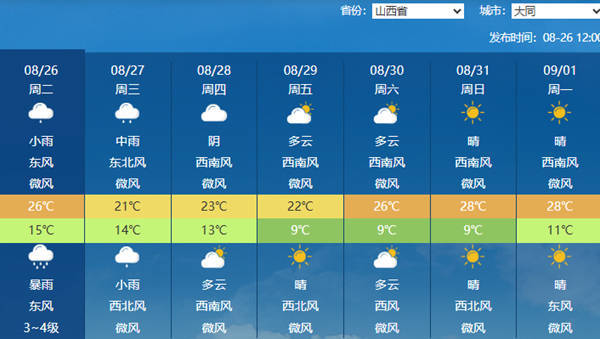 r此外,伴随降雨,山西部分地区还将出现明显降温,例如大同,今天最高气温26℃,暴雨过后,明天将降至21℃,凉意显现。